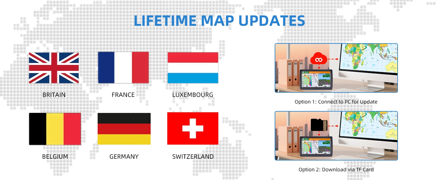 - 【Lifetime Free Updates】Your sat navs for cars uk 2025 comes preloaded with detailed maps for the UK, Ireland, and all of Europe. Enjoy lifetime free map updates via PC connection, ensuring your navigation always reflects the newest roads, speed limits, and traffic regulations.