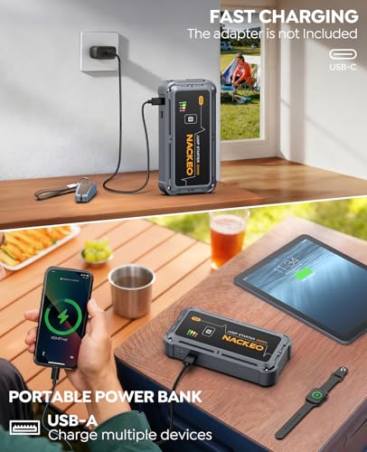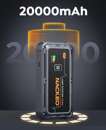 【Powerful 12V Car Jump Starter】Start your vehicle in just seconds with the NACKEO 12V portable car jump starter. Equipped with a high-performance battery that delivers strong peak current, this jump box for car battery portable unit can jump-start your sedan, SUV, or motorcycle without needing another vehicle. It is especially useful in cold weather or emergencies after long periods of vehicle inactivity.