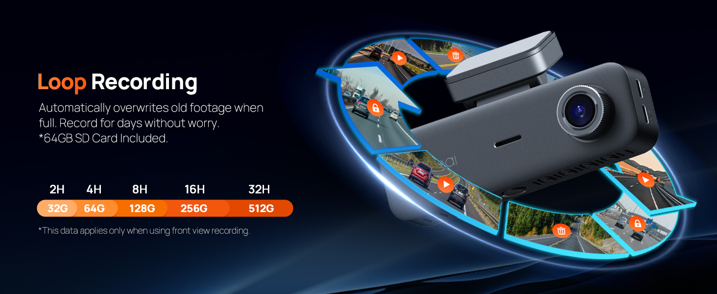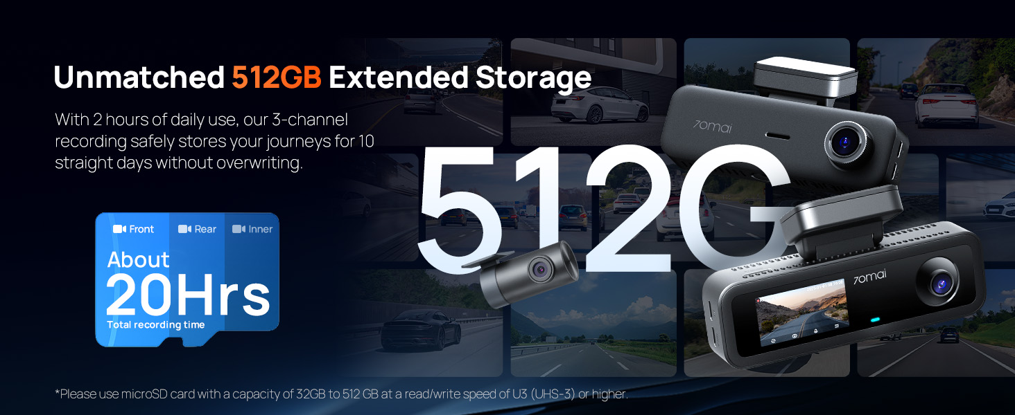 - 【Massive 512GB Expandable Storage】While a 64GB card is included to get you started. 70mai three channel dash cam T800E support expansion up to a massive 512GB which is perfect for long trips, daily commuting, or extended parking surveillance without the anxiety of running out of space. *Please use microSD card with a capacity of 32GB to 512 GB at a read/write speed of U3 (UHS-3) or higher.