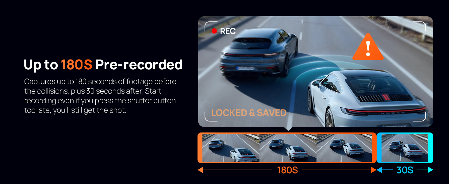 - 【Emergency Recording Up to 210s】70mai T800E offers a longer emergency video pre-recording solution. Automatically records 10s–3min before impact + 30s after. The extended duration captures the crucial moments leading up to the collision and the immediate aftermath, providing the full context you need. The video recordings before and after the impact will recorded in a special folder for easy viewing.