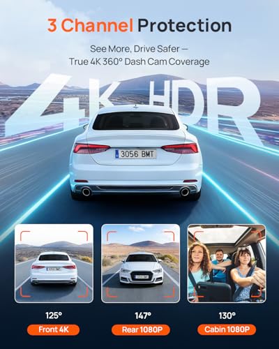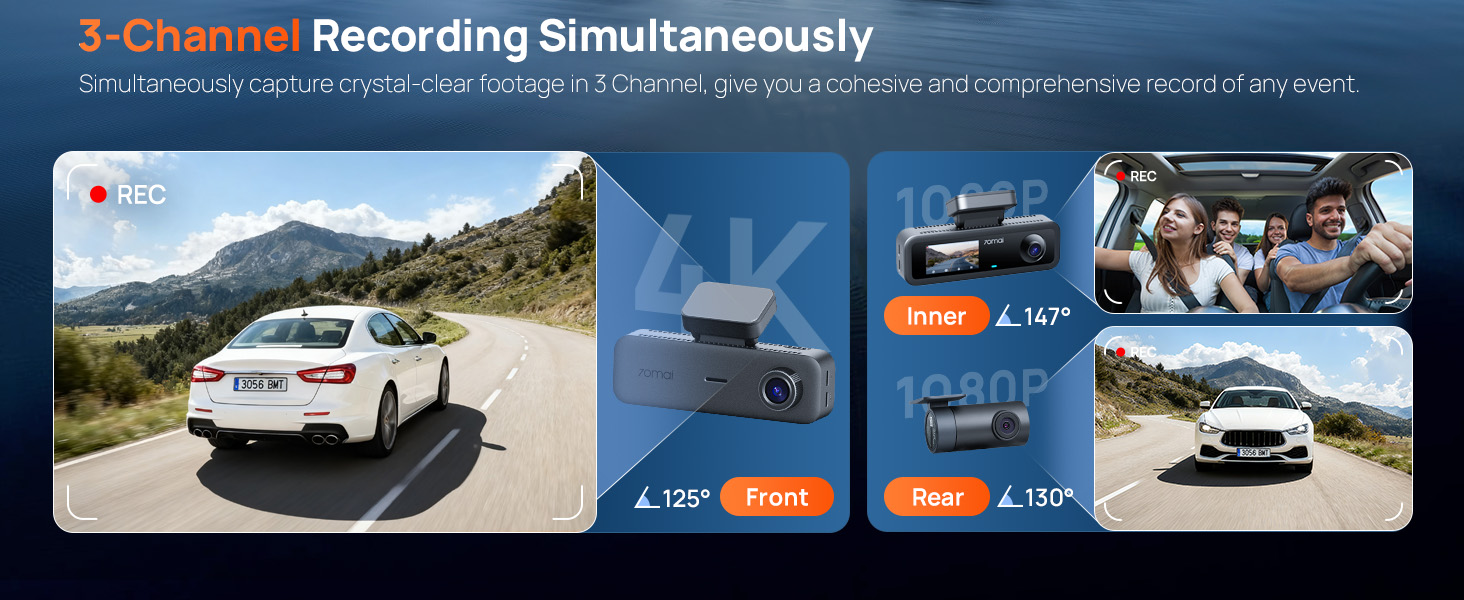 - 【4K 3 Channel Dash Cam】Experience superior three channel recording (Front 4K + Interior + Rear) , 70mai T800E can monitor your entire surroundings simultaneously with three wide-angle lenses: Front (125°), Interior (147°), and Rear (130°), 70mai triple dash cam is ideal for daily drivers, Uber, taxi, and family trips. Capture every crucial moment with full coverage, never miss a detail inside or outside your car.