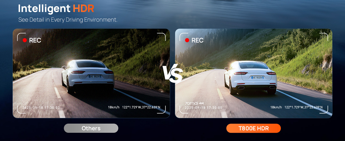 - 【Crystal Clear 4K Front Recording & HDR】Capture license plates and road signs with exceptional detail thanks to advanced 4K front video. Equipped with the F1.55 large aperture, it captures more light. Combined with Smart HDR & 70mai Night Owl Vision technology, 70mai T800E dash cam delivers exceptionally clear, balanced, and vivid video in various lighting, from tunnels to bright sun, optimized the photography performance in low-light condition.