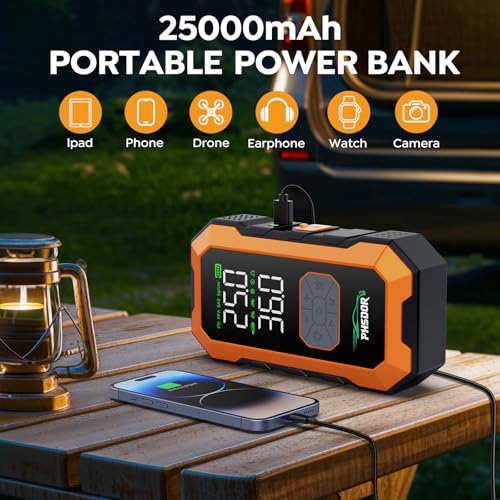 - 【Newest Jump Starter】: 8000A peak current for all gas/10L diesel✅ 25000mAh high capacity battery✅ 1-Minute rapid tire inflation✅ 12-Protection smart jumper cable ✅ 3-Mode emergency lights✅ 24-Month standby power bank✅ 1000+ recharge cycles✅ Smart LCD display✅