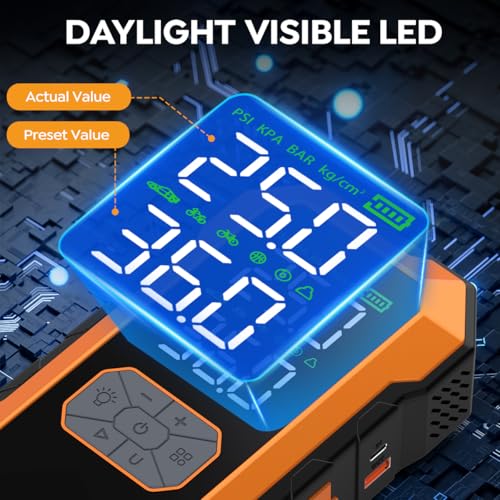 - 【1 Min Rapid Tire Inflation】: Our car battery booster jump starter includes a high-pressure (150 PSI, 45L/min) for rapid tire inflation—just 1 minute for standard car tires (25-36 PSI). Features smart pressure preset and auto stop. Wide compatibility: from vehicles to all kinds of balls.