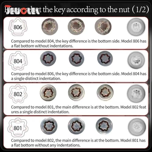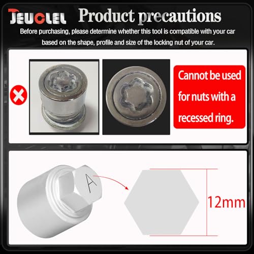 - Ideal Tool: JEUCLEL 802 wheel locking nut key for Jeep Renegade, Wrangler, Cherokee, Dodge Journey (2016-2020), used to remove and install wheel anti-theft nuts. A wheel locking nut is prized for its durability, convenience, and practicality, making it an indispensable tool for automotive maintenance and repairs. If you are not sure, please contact us to help you determine. (Please note that it is not suitable for use with pneumatically driven tools).