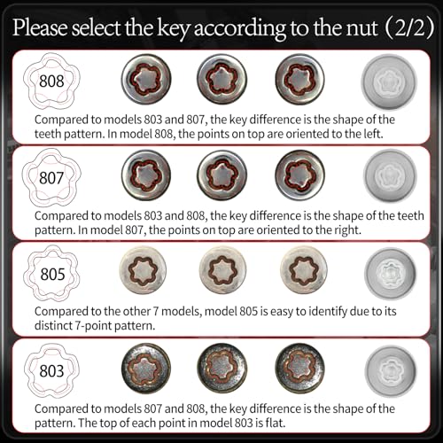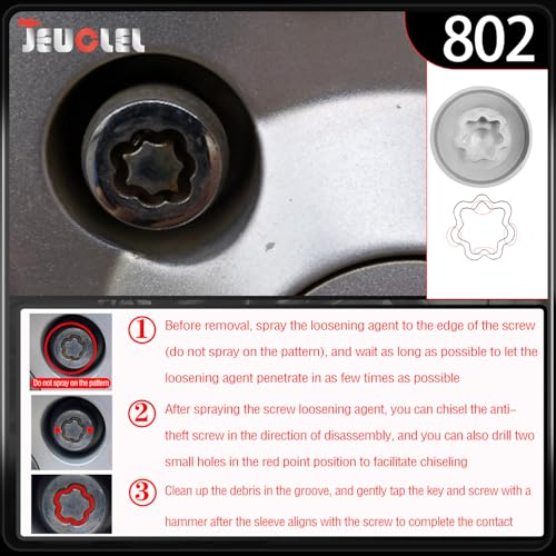 JEUCLEL 802 wheel locking nut key for Jeep Renegade, Wrangler, Cherokee, Dodge Journey (2016-2020), used to remove and install wheel anti-theft nuts. A wheel locking nut is prized for its durability, convenience, and practicality, making it an indispensable tool for automotive maintenance and repairs. If you are not sure, please contact us to help you determine. (Please note that it is not suitable for use with pneumatically driven tools).