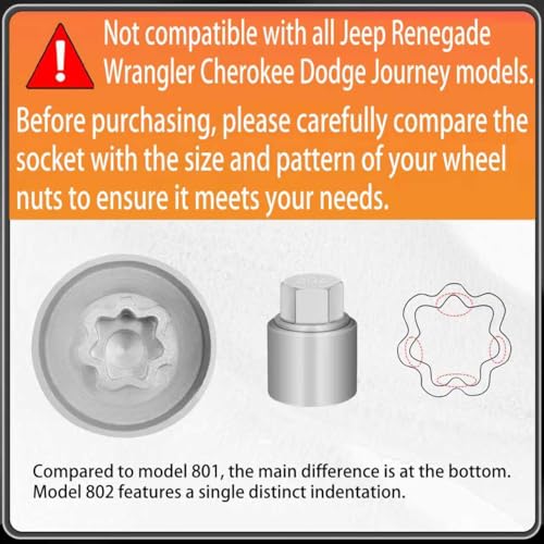 - Note: 802 is designed exclusively for Jeep Renegade, Wrangler, Cherokee, and Dodge Journey (2016-2020) with 29mm wheel locking nuts and is not compatible with other models featuring different sizes. Ensure compatibility with your vehicle before purchase to avoid any issues. If you are not sure, please contact us to help you determine.