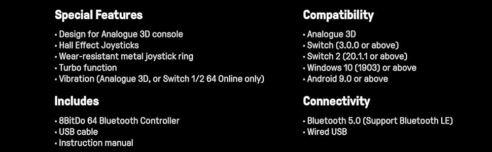 - Compatible with Analogue 3D, Switch, Switch 2, Windows, and Android. (Switch 2 compatibility requires latest firmware update)
