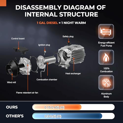 【Durable, Quiet and Reliable Operation】Constructed from metal and ABS plastic, the heater is built to withstand harsh conditions. Advanced combustion and airflow design ensure minimal operational noise while maintaining stable temperatures. Automatic thermostat and overheat protection guarantee safe, reliable performance during extended use.
