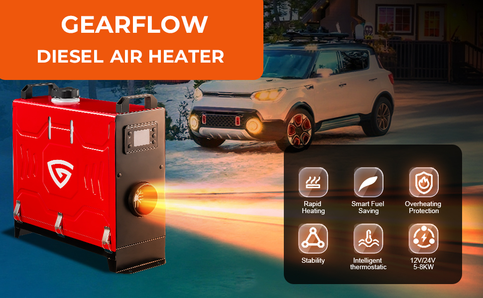 【All-in-One Diesel Air Heater】The GEARFLOW 8KW diesel air heater delivers rapid, consistent heating for cabins and engine preheat in cold conditions. Designed to operate from -40°C to +50°C, it keeps your vehicle warm while defrosting windscreens, preventing engine wear during low-temperature starts.