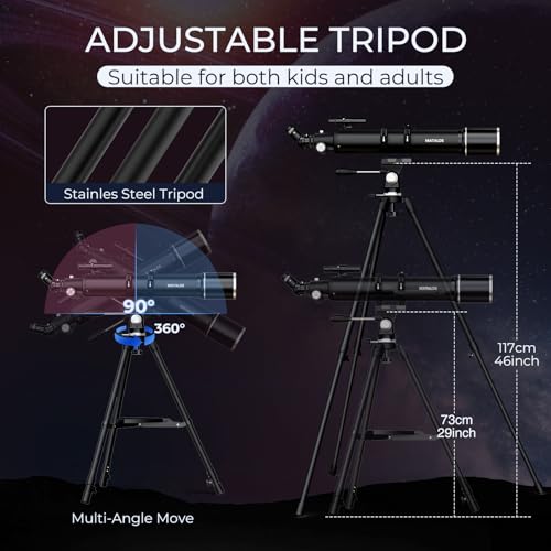 ADJUSTABLE TRIPOD & ALT-AZIMUTH MOUNT – The stable, adjustable iron tripod extends from 26 to 46 inches for comfortable viewing at any height. Combined with the Alt-Azimuth mount, it offers full 360° horizontal and 90° vertical movement, making it simple to smoothly track objects across the entire night sky.