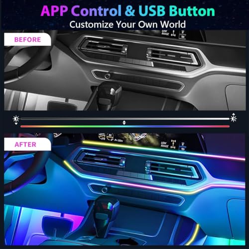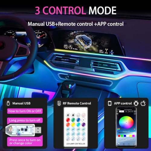 Seamless Control:APP,Remote & USB Operation Manage your acrylic interior car lights effortlessly through multiple interfaces.Adjust brightness,modes,and timing via the dedicated app or remote.The led light strip for car also features offline USB control,ensuring functionality without internet or Bluetooth dependency.
