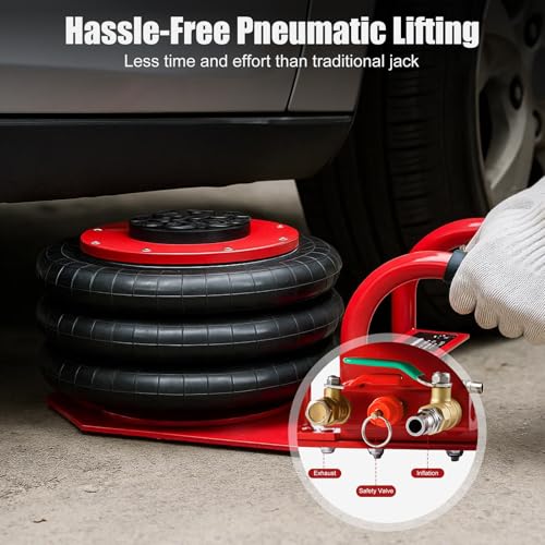 [Precise Control and Safe Release] The car jack hydraulically lifts and lowers vehicles with precise control. An easily accessible pneumatic control lever allows for smooth, progressive lifting. An integrated mechanical safety release valve ensures a slow, controlled, and safe descent each time, giving you peace of mind.