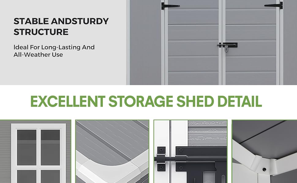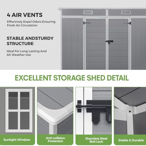 All-Weather Outdoor Storage Plastic Shed, Gray Plastic Material, Double Door Design with Window, Garden Storage for Bikes and Tools