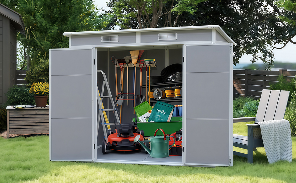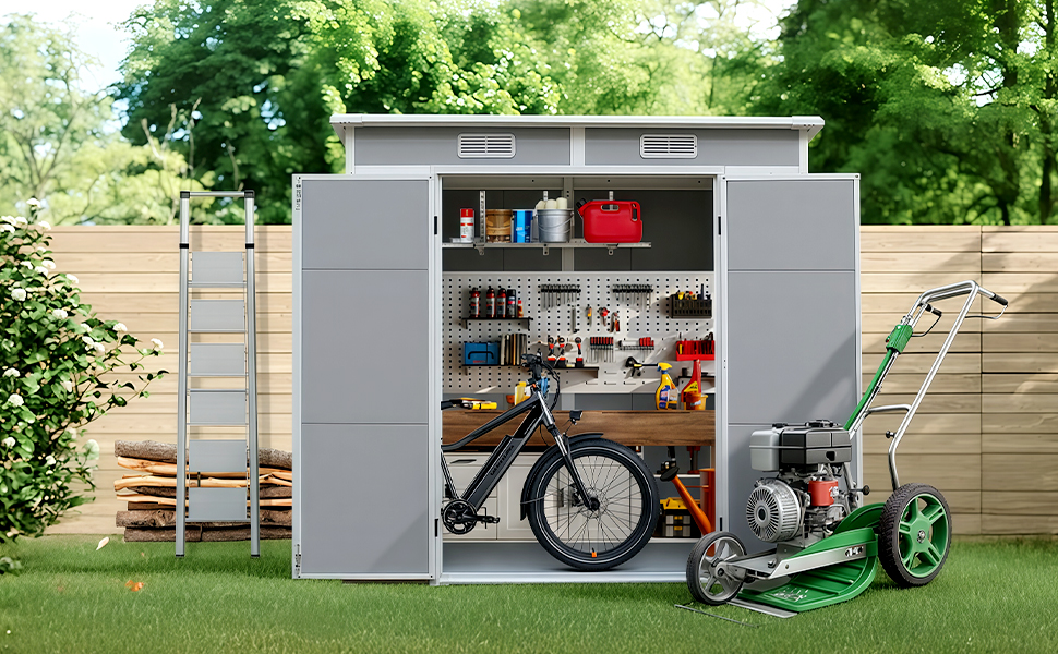 SPACIOUS STORAGE: Double door design provides easy access to store large items like bicycles, garden equipment, and tools with organised shelving options
