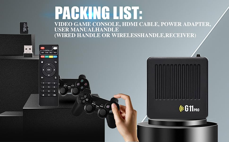 How to set it up: 1. Connect the Retrowave G11 Pro to your TV or monitor. 2. Plug the power cord into the Retrowave G11 Pro and then the USB cable into your TV, monitor, or other power source. 3. Connect the controller receiver to the Retrowave G11 Pro. Then insert batteries into the controllers and make sure they are switched on using the power switch on each controller. 4. Connect your TV to the correct HDMI input.