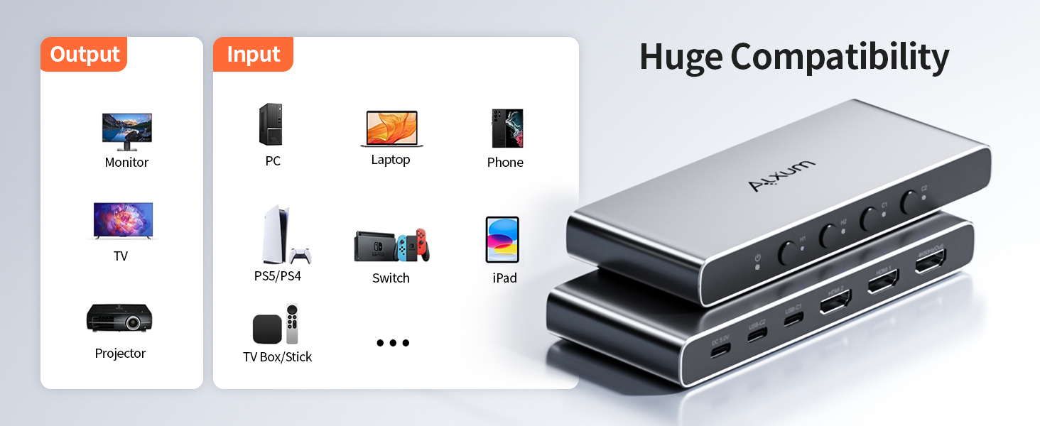 - 4×1 out Video Switches-Simplify your audiovisual setup by connecting four distinct devices to a single display. The Alxum switcher features two HDMI inputs, two USB-C inputs, and one HDMI output, offering versatile connectivity solutions to integrate laptops, desktops, and set-top boxes into a single monitor. An ideal choice for creating a streamlined multi-device workstation or presentation platform