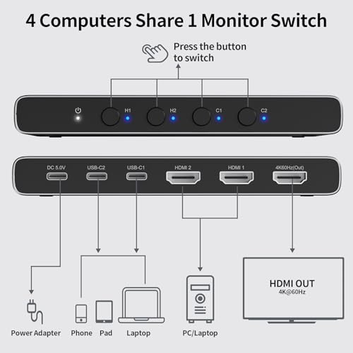 Alxum Aluminum Dual USB-C&HDMI Switch 4 PC 1 Monitor 2x HDMI & 2x Type C Inpu to 1xHDMI Video Switcher HDR for 4 Computers Share A Single Monitor Support 4K@60Hz HDR for Laptop/Phone/PC/TV Box Grey
