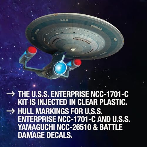 - FEATURE PACKED: The U.S.S. Enterprise NCC-1701-C kit is injected in clear plastic making it perfect for lighting. Kit also includes hull markings for U.S.S. Enterprise NCC-1701-C and U.S.S. Yamaguchi NCC-26510, battle damage decals and all new packaging. Lighting kit not included.
