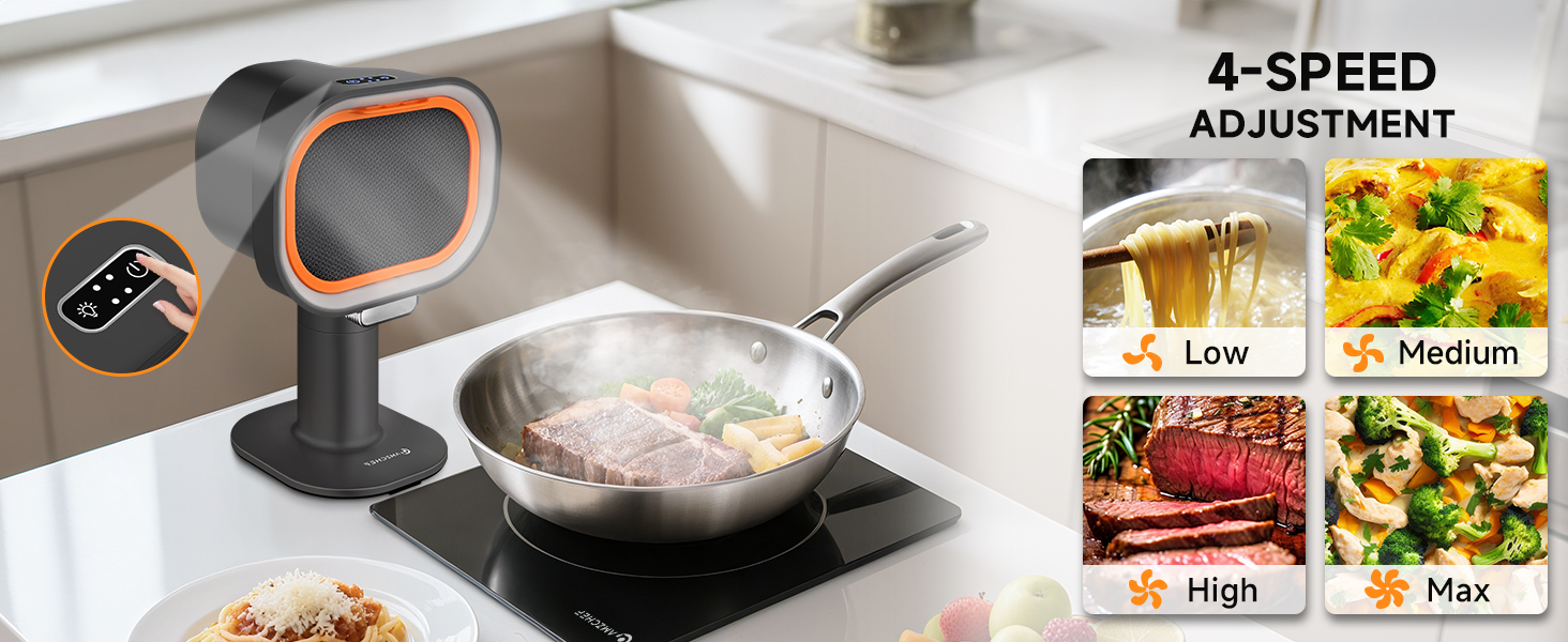 - 4-level mode + ring light: AMZCHEF mini cooker hood has four adjustable speed settings that can be precisely adjusted to different cooking modes and thus ensure energy efficiency and environmentally friendliness. The newly improved highest speed level supports unlimited use. The modern ring-shaped LED light ring greatly enlarges the illuminated area and meets your cooking needs at night.