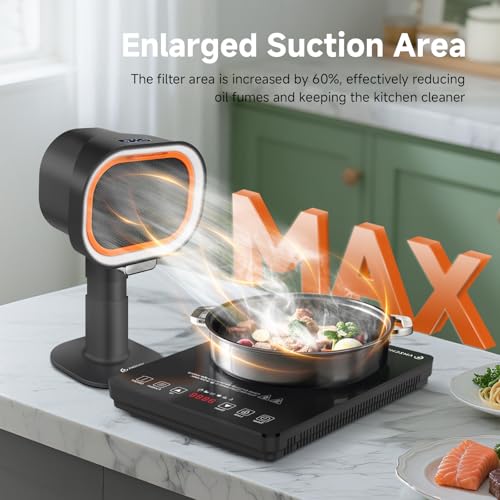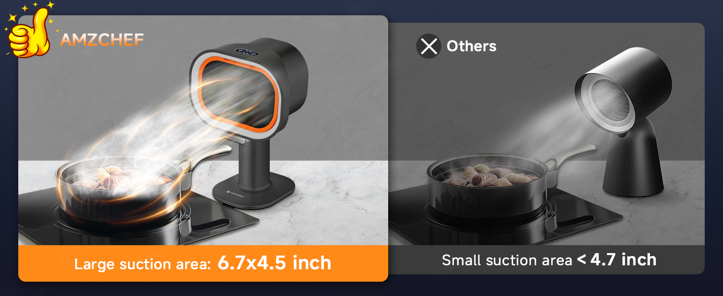 - Improved suction performance: AMZCHEF version 2.0 mobile cooker hood has a large diameter aluminium filter screen that provides a 60% larger coverage area than competitor products and effectively cleans smoke and odours before they are dissipated at the back. Thanks to its compact and lightweight design (net weight 1.5 kg), it is ideal for small kitchens or motorhomes. It supports the replacement of filter wadding with 10 pieces included.