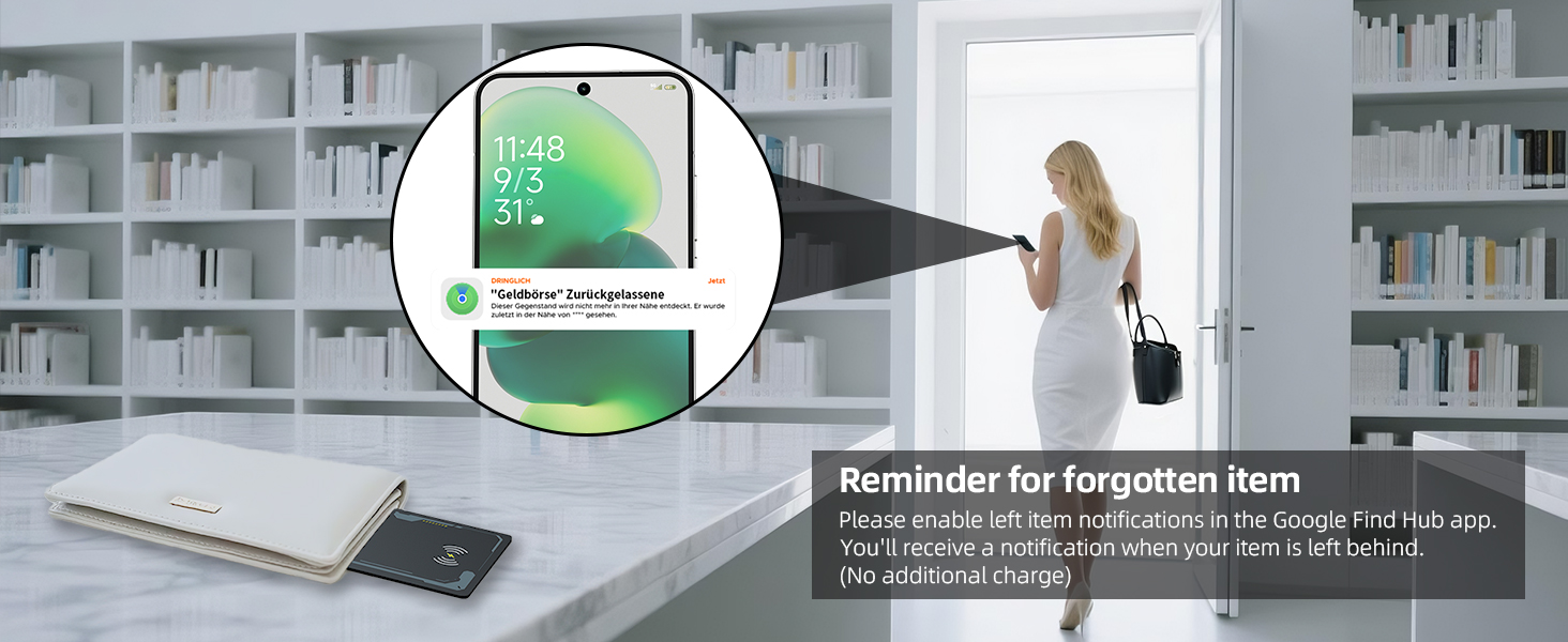 - 【Lost Mode】Enable Lost Mode for your tracking card for wallet. If you lose your belongings or smart tag while traveling or outdoors, your location information will be transmitted to you via Google Find Hub as long as an Android device can detect the smart tag. Additionally, your phone will receive a notification when your Bluetooth connection to the smart tag Android is lost.
