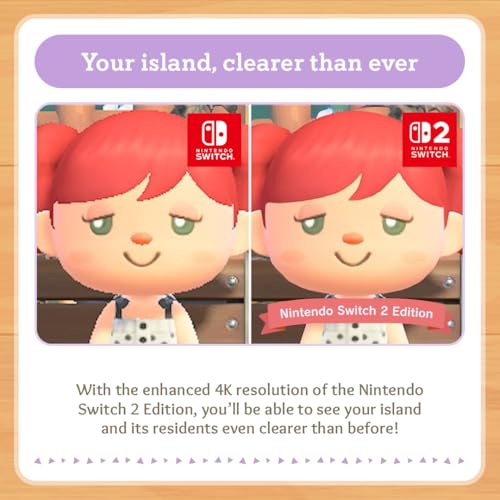 - Your island, clearer than ever With the enhanced 4K resolution of the Nintendo Switch 2 Edition, you’ll be able to see your island and its residents even clearer than before! Get creative with mouse controls Use the intuitive mouse controls of the Joy-Con 2 controller to redecorate your home, organise your furniture, create Custom Designs and even draw posts for the bulletin board.