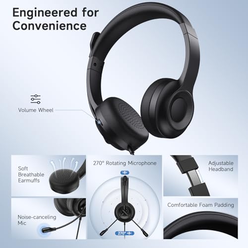 [All-Day Comfort for Long Wear] – Soft protein-memory ear cushions designed for offices, call centers, and remote work, this comfortable pair of wired headphones with mic also works great as headphones with microphone for computer for extended study sessions and everyday use