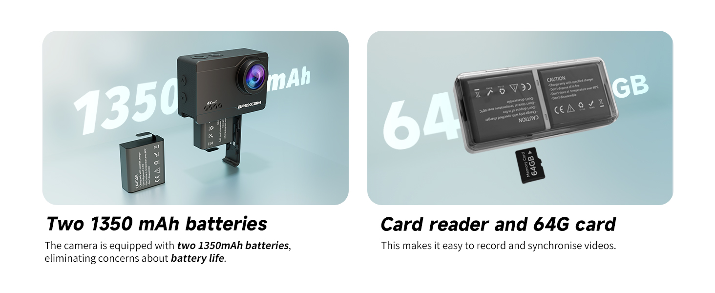 - 【Multiple Accessories and Warranty】This underwater camera comes with various accessories, it is suitable for most action cameras. Comes with 2 x 1350mAh rechargeable batteries which support video recording for longer time. It is very suitable for swimming, rafting, surfing and other water sports as well as outdoor sports such as rock climbing, cycling, mountain climbing and so on.