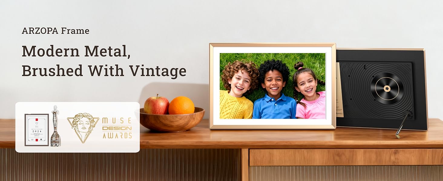 - ELEGANT & DURABLE GOLD METAL FRAME: Featuring a vintage gold metal frame with a premium gramophone design on the back (2024 MUSE Award Winner), perfect for mantels, desks, or shelves, and ideal as a luxury gift for loved ones.