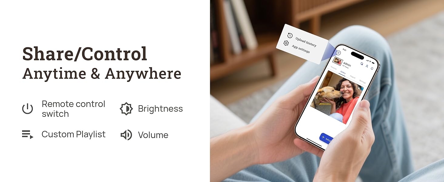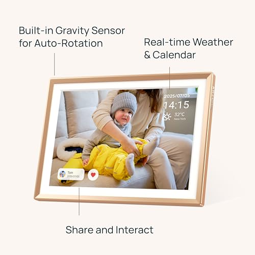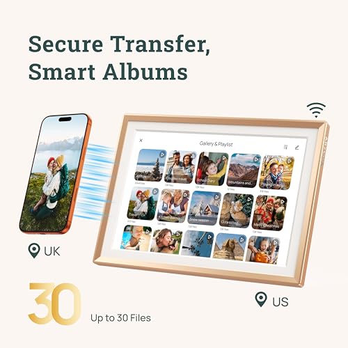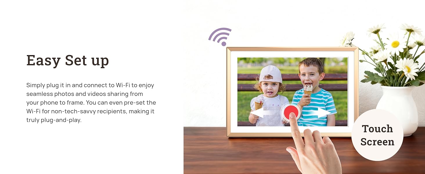 - EASY SETUP, EXCELLENT CUSTOM APP: Pre-set Wi-Fi for non-tech-savvy recipients (plug & enjoy). Manage your smart digital frame with 30+ folders and share unlimited photos & videos (up to 2 mins per video, ≤125MB, 1080p).