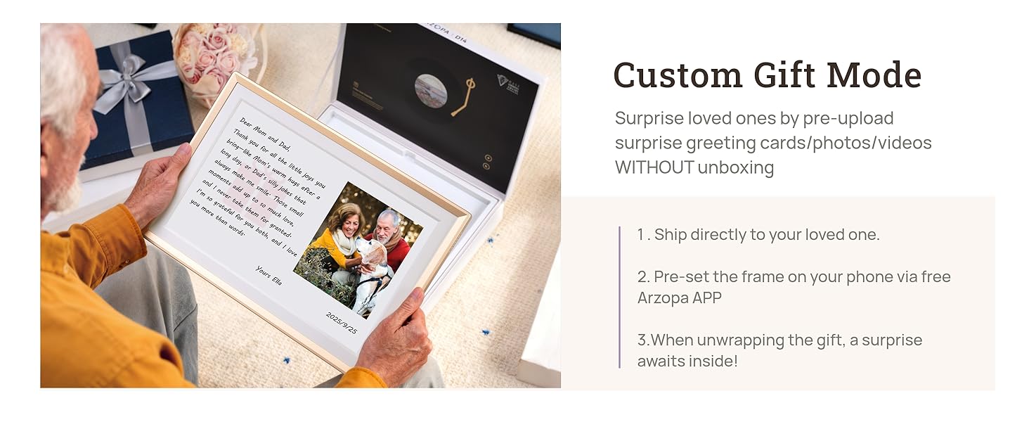 - GIFT-READY FEATURE, PRE-LOADED JOY: Preload photos videos & greeting cards via FREE Arzopa APP for a personalized surprises gift before the arzopa frame arrives without unboxing.