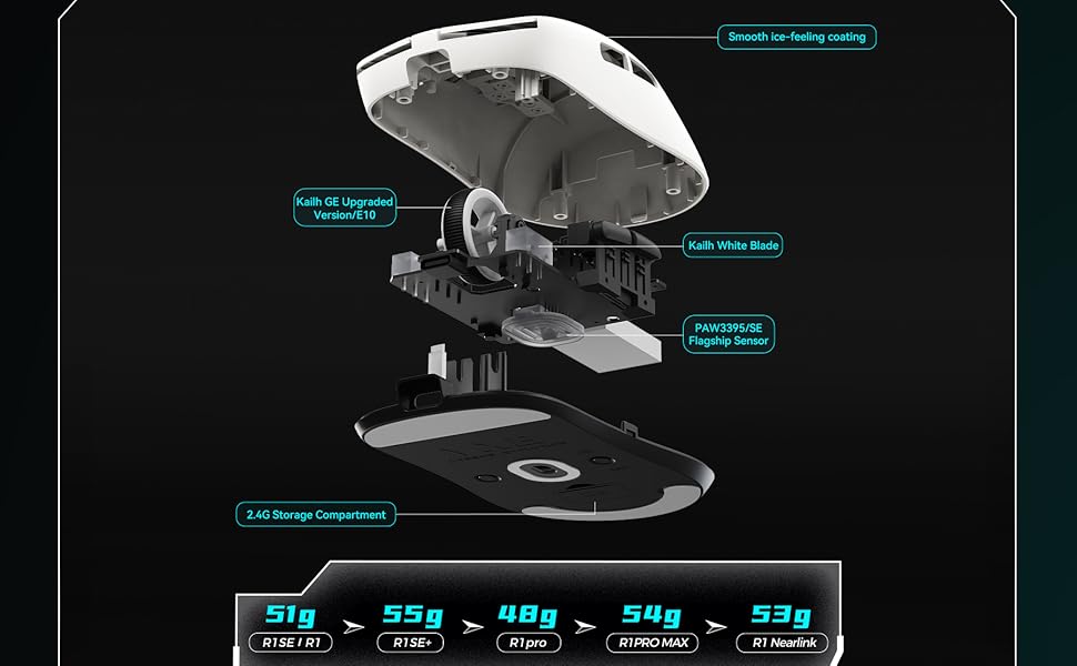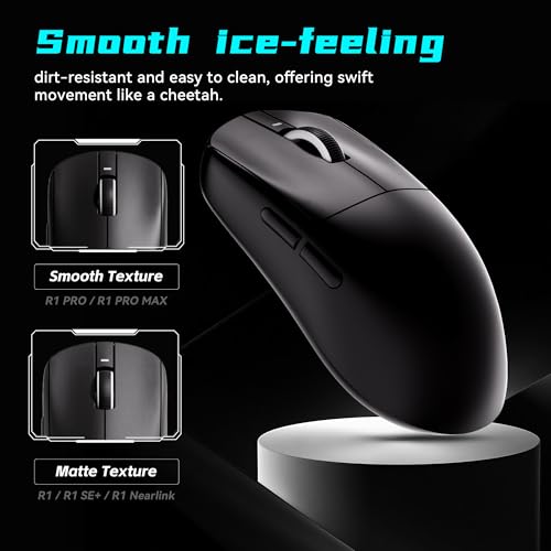 - PRECISION PIXART SENSOR: Base models (R1 SE) use PAW3395 SE (up to ~18,000 DPI); higher models (R1, R1 Pro, Pro Max) use PAW3395 (up to 26,000 DPI).