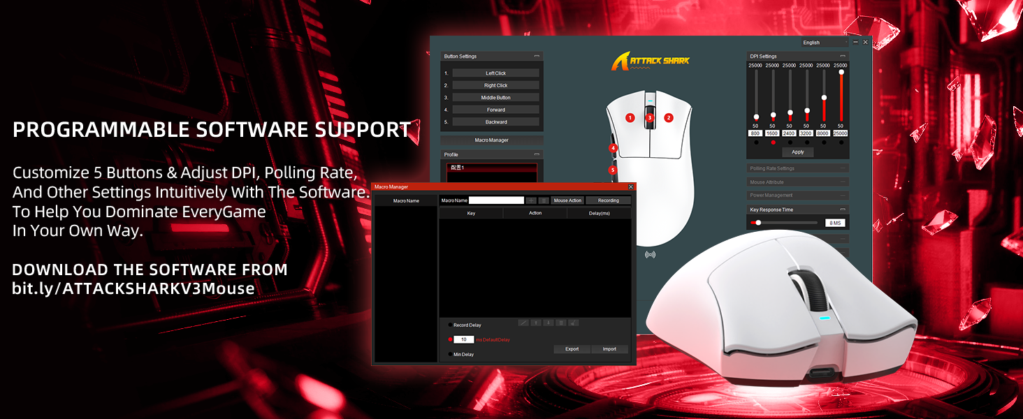 - 5 PROGRAMMABLE BUTTONS: Further optimize performance with the ATTACK SHARK app. Configure your wireless mouse in our software to program buttons, DPI/IPS settings, lift-off height, button remapping, player settings, powerful macro settings, and more to meet all your control needs.【Driver Download: bit.ly/ATTACKSHARKV3Mouse】