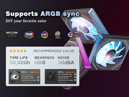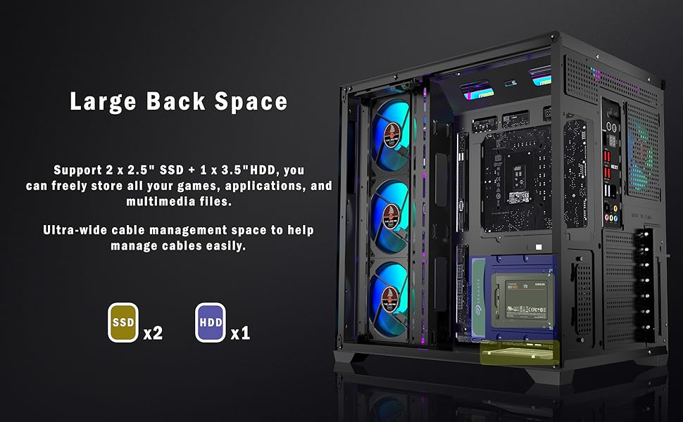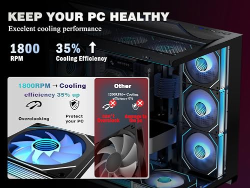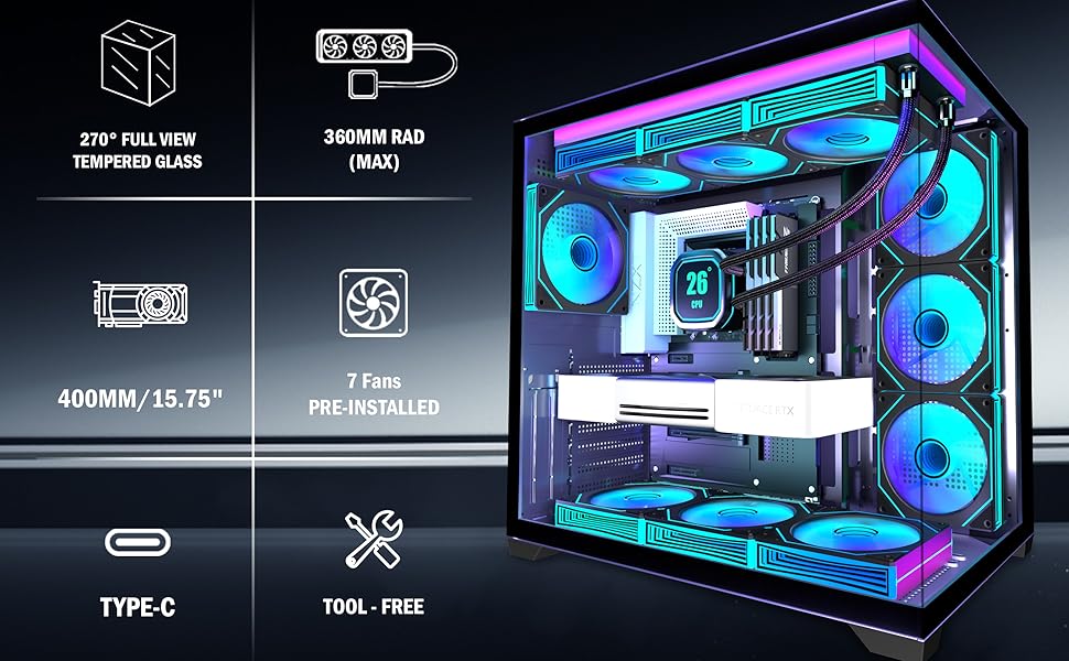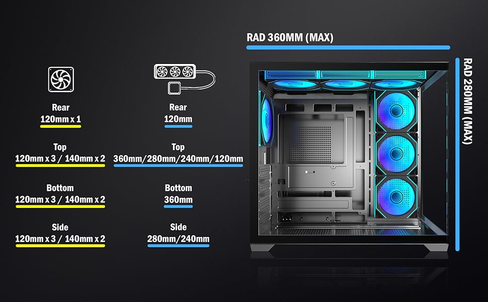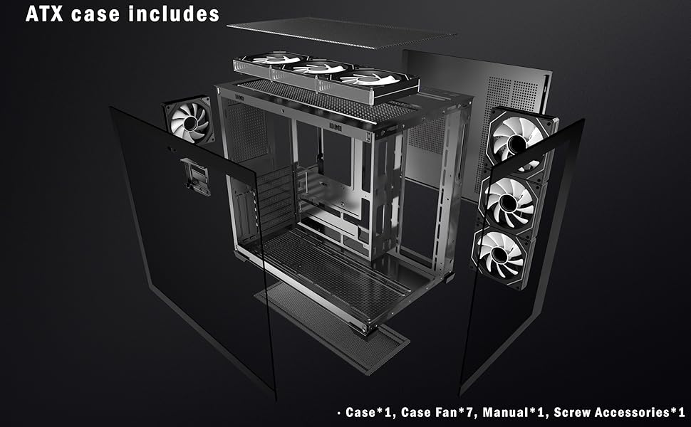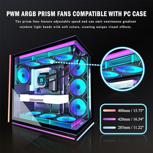 - [Pre-installed 7 PWM ARGB Prism Fans] Top pre-installed with 3×120mm forward-blade fans, bottom pre-installed with 3×120mm reverse-blade fans (H12R ARGB PWM), side panel pre-installed with 3×120mm reverse fans (reverse-blade design combines aesthetics with intake cooling efficiency).featuring a daisy-chain design and 1-to-3 splitter for neat,simplified cable management.Compatible with motherboard synchronized lighting effects