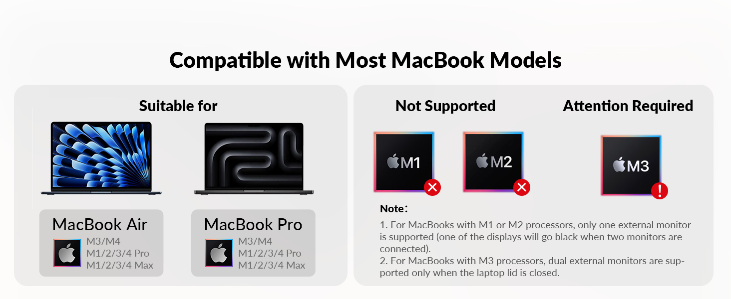 Intel / M1 or M2 (non-Pro/Max): iDock M10 can extend to only one external display. M3 (non-Pro): up to two extended displays when the lid is closed; lid open supports mirroring only.