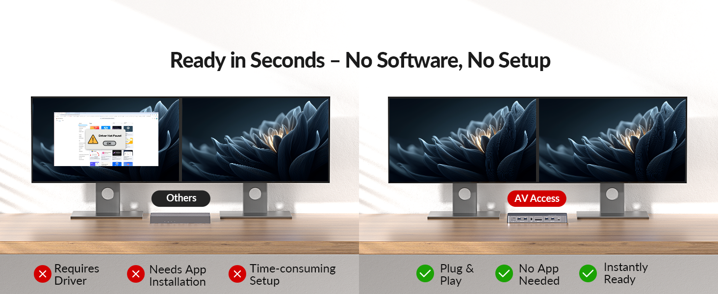 1. iDock M10 is fully plug-and-play with no software needed, so it works freely and poses no security risk. 2. iDock M10 sends DP Alt video signals directly over USB-C without compression, ensuring stable and reliable video quality.