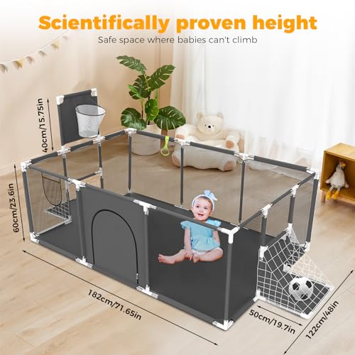 Baby Playpen 182 * 122cm,Playpen for Baby and Toddlers with Baskeball &Football Hoop,Foldable Play Yard for Babies with Breathable Mesh,Stand Rings,Non-Slip Base,Baskeball,Football,Color Balls