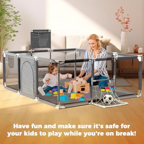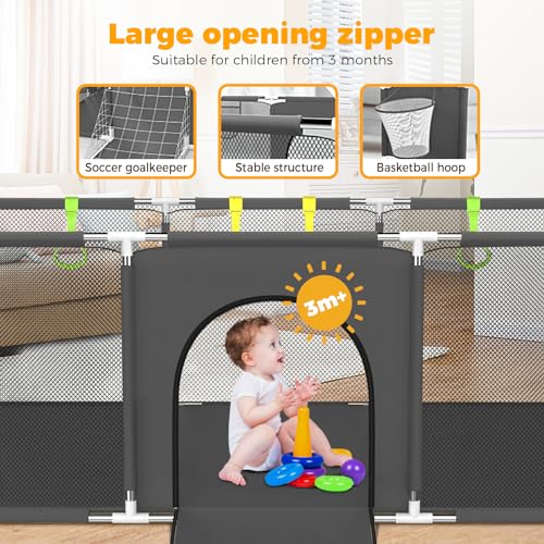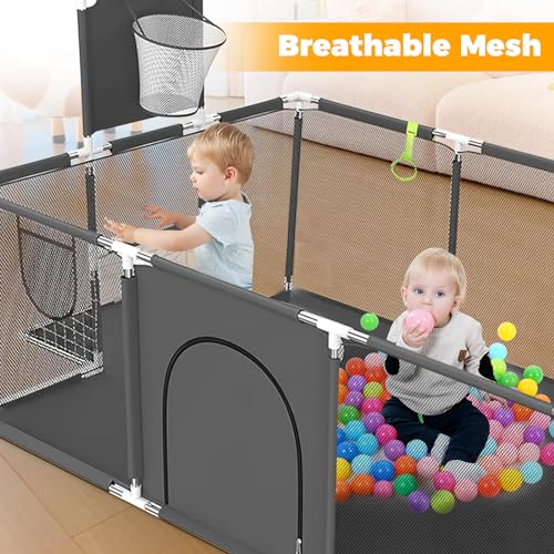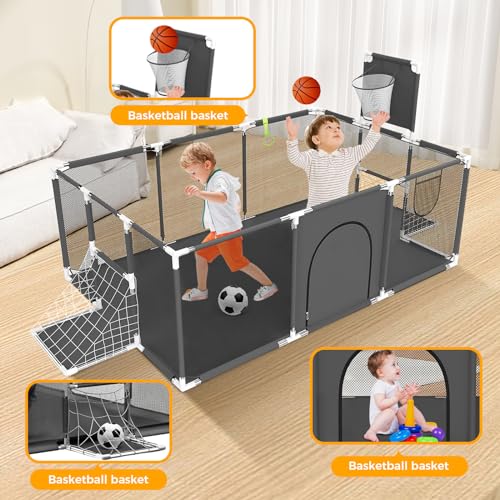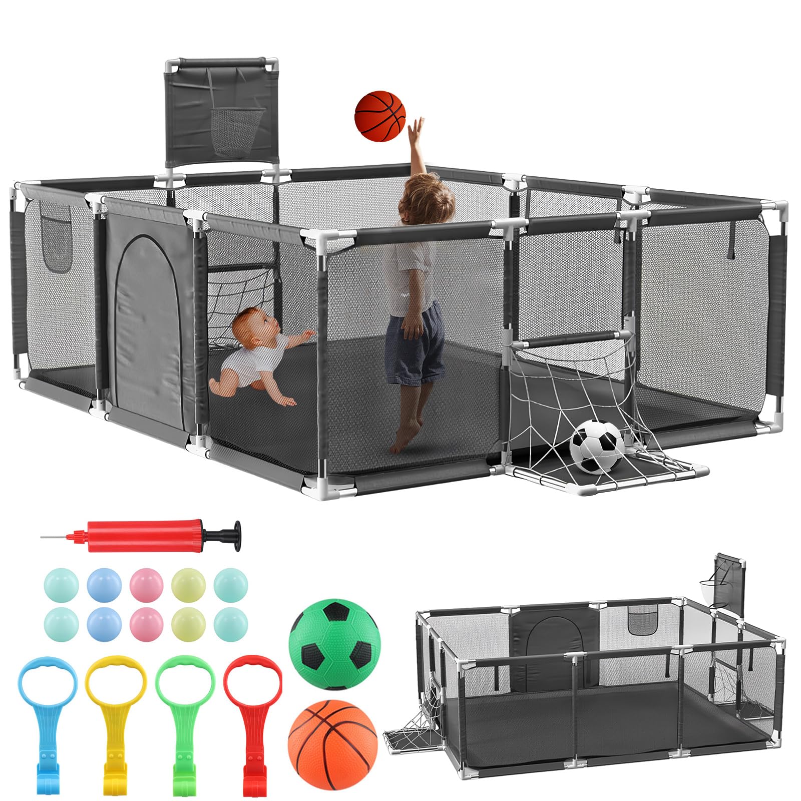 - 【Enjoy the Happy Baby Playpen Set】This playpen set measures 182*122*68cm, large enough to accommodate 2-3 children under the age of 4 to play to their heart's content. On both sides of the playpen, we have equipped a basketball hoop and a goal, and provided a basketball, a soccer ball, and an air pump for easy play. We also provide 10 small plastic balls to decorate the inside of the playpen, stimulating children's interest.