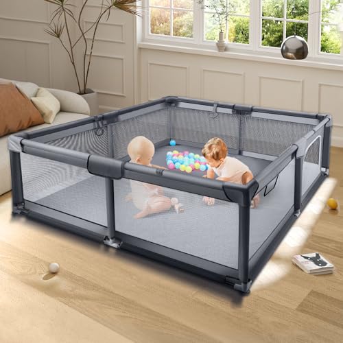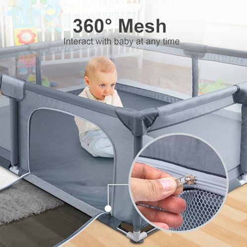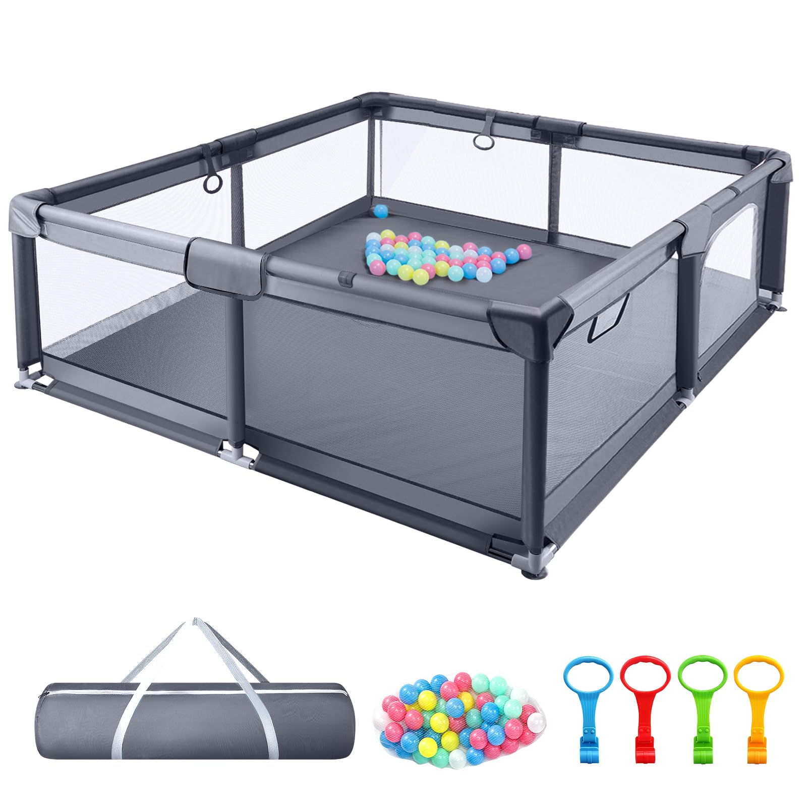 Baby Playpen for Toddlers with Soft Fabric Bumpers, Large Safety Play Yard with Mesh Walls, Ocean Balls & Pull Rings Included, Indoor & Outdoor Baby Fence (Gray, 150x180cm)