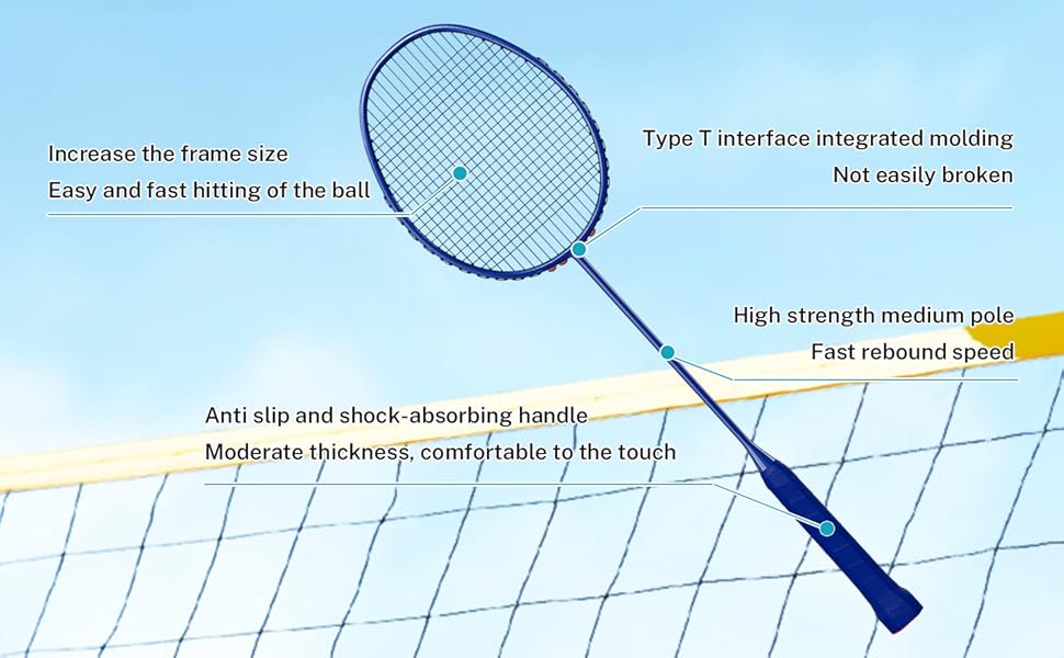 【one-piece molding】The badminton rackets has a sturdy structure, with an integrated design on the outside and a built-in T-shaped joint. The middle pole has moderate hardness and fast resetting speed.