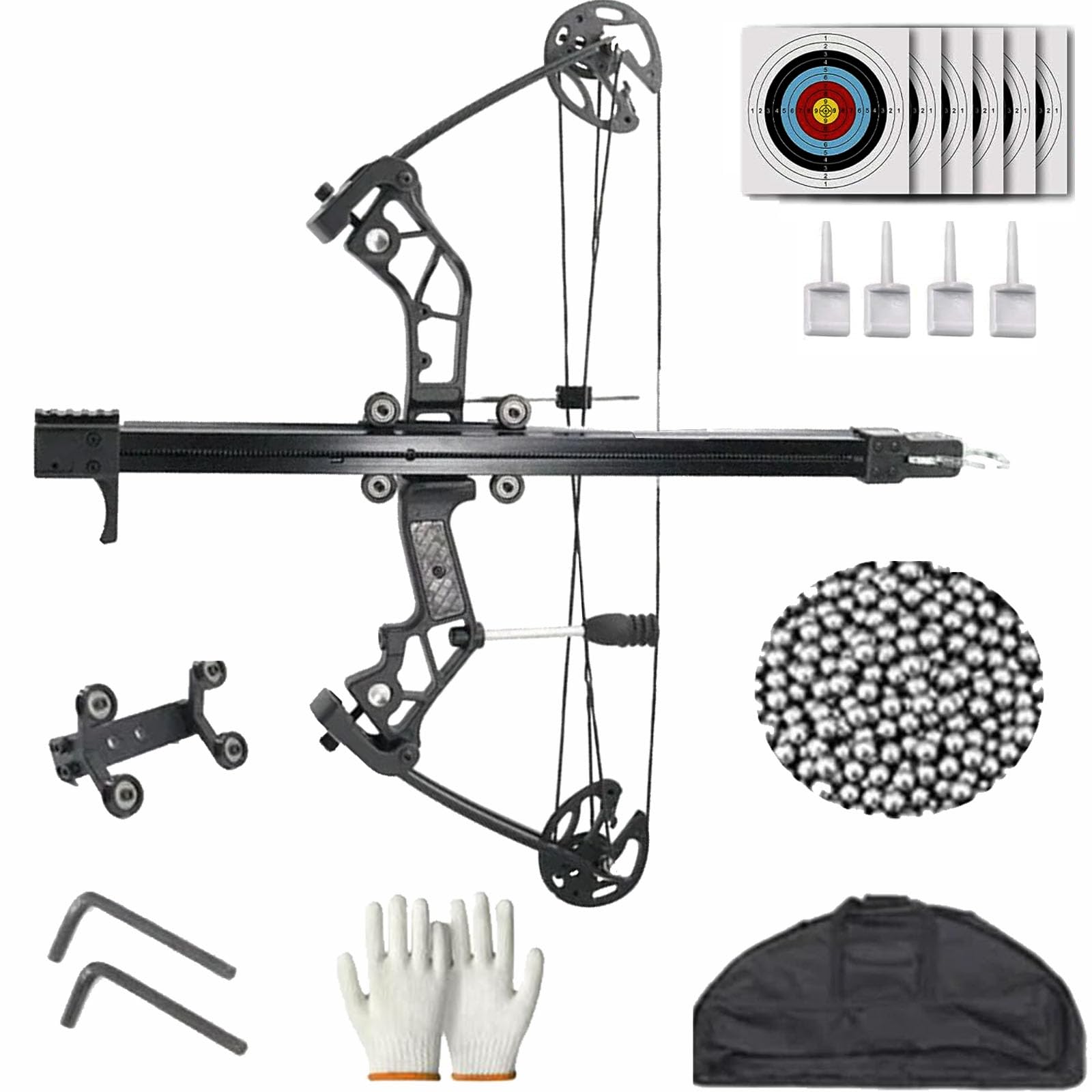 - The packaging includes: 1 * Dual-purpose compound bow.6 * target paper.4 * Target Pin.1 * Storage bag.2 * Gloves.1 * Shooter mount.1 * Installation tool.200 * steel balls.