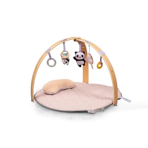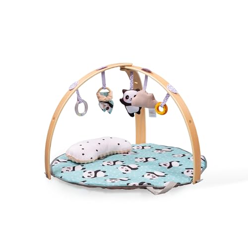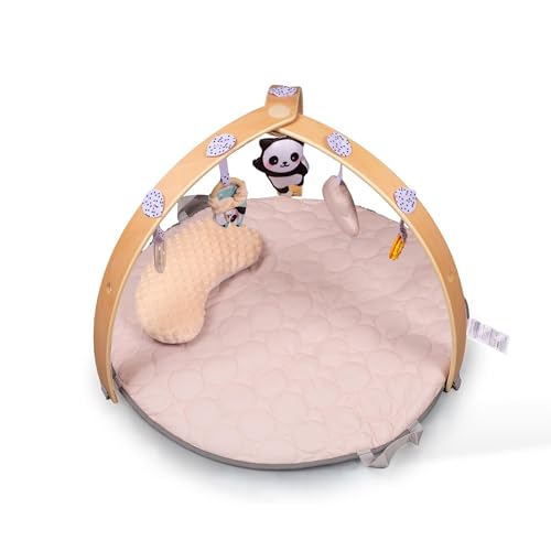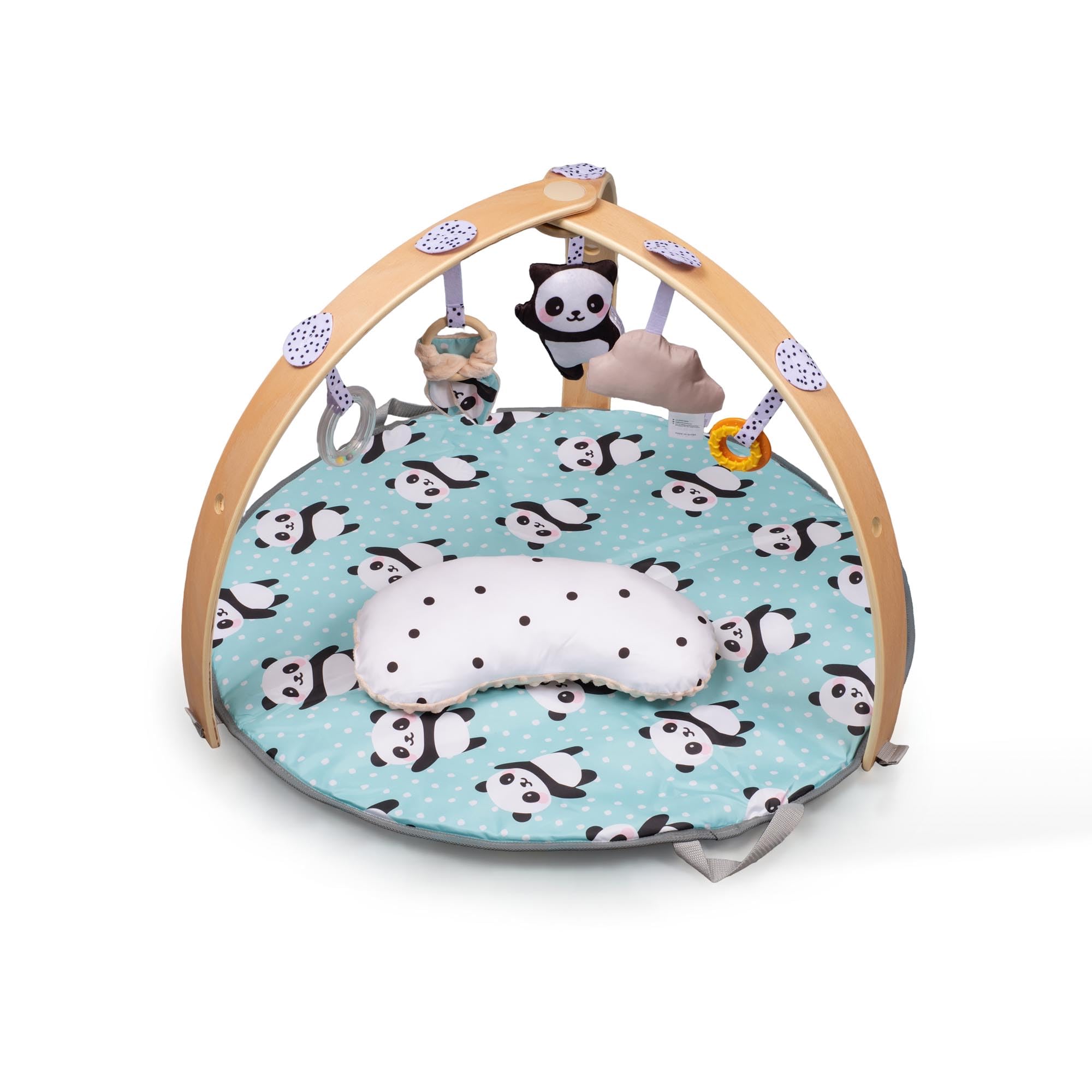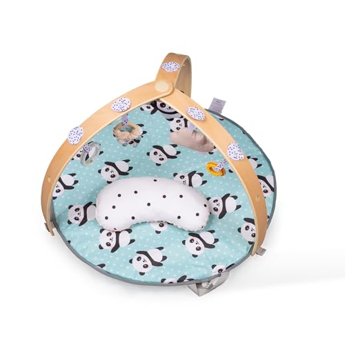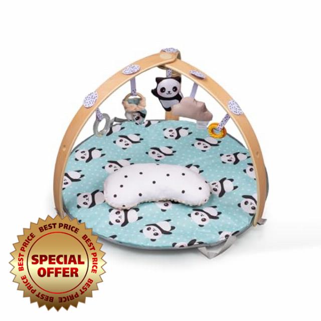 Luxury Double-Sided Baby Play Mat with Wooden arches Play Gym – Panda Collection A serene space for play, discovery, and growth. Designed for the modern parent and their little explorer, this luxurious double-sided play mat blends timeless style with thoughtful functionality. Crafted with natural wood and the softest fabrics, it transforms playtime into a beautiful sensory experience. Tummy Time Comfort: Comes with a plush, supportive pillow to aid early muscle development and provide extra comfort during play. Premium Craftsmanship: Luxuriously padded, baby-safe fabrics create a soft and supportive base, while the removable mat and toys are machine washable for effortless care.