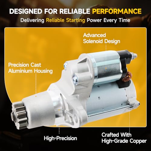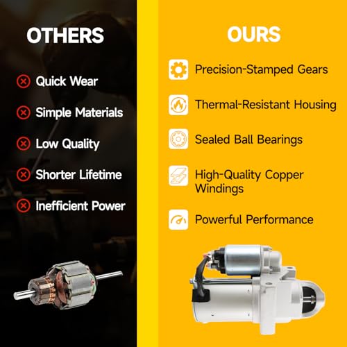 【Durable Construction】The starter motor is built with durable materials, resulting in a long lifespan and the ability to withstand frequent start-stop cycles. Drive End Housing made of Aluminum-Alloy Die-Castings for strong corrosion protection. Plunger made by CNC machining to ensure accurate and precise size. Solenoids and armatures use 200°C high-temperature resistant copper wire to guarantee longevity. Planetary Shaft and Starter Drive engineered and tested for maximum durability.