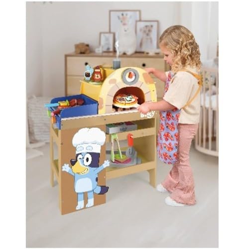 - PREMIUM DESIGN: Floor-standing wooden pizza oven playset featuring Bluey-themed graphics and multiple play areas for an immersive restaurant experience
