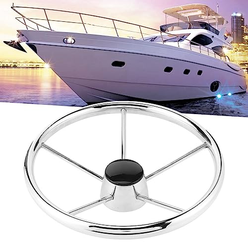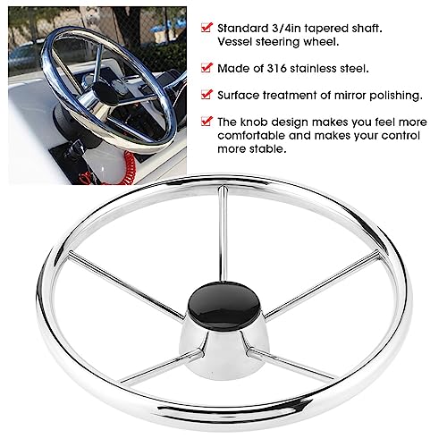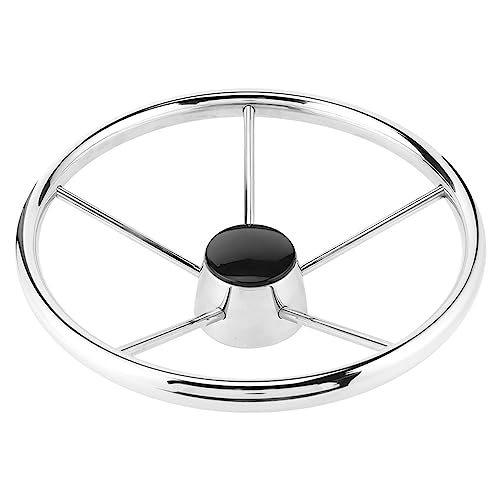 [PREMIUM MATERIAL] Crafted from high quality 316 stainless steel this boat steering wheel ensures exceptional durability and making it for harsh marine environments. The robust construction guarantees long lasting performance even under extreme conditions. [STYLISH DESIGN] Featuring a sleek mirror polished surface and a 5 spoke design this steering wheel adds a touch of elegance to your vessel. The included black plastic center cover enhances practicality while maintaining a sophisticated look. [COMFORTABLE CONTROL] Designed with an ergonomic knob this steering wheel provides a comfortable grip ensuring smooth and stable control. The tactile feedback enhances your driving experience reducing fatigue during long trips. [EASY INSTALLATION] Equipped with a standard 3/4 inch tapered shaft this steering wheel is compatible with most boats and can be installed quickly without any hassle. The straightforward setup saves you time and effort. [LOW MAINTENANCE] The mirror polished surface and stainless steel material make this steering wheel easy to clean and maintain. Its to and wear ensures it stays in pristine condition with minimal effort.