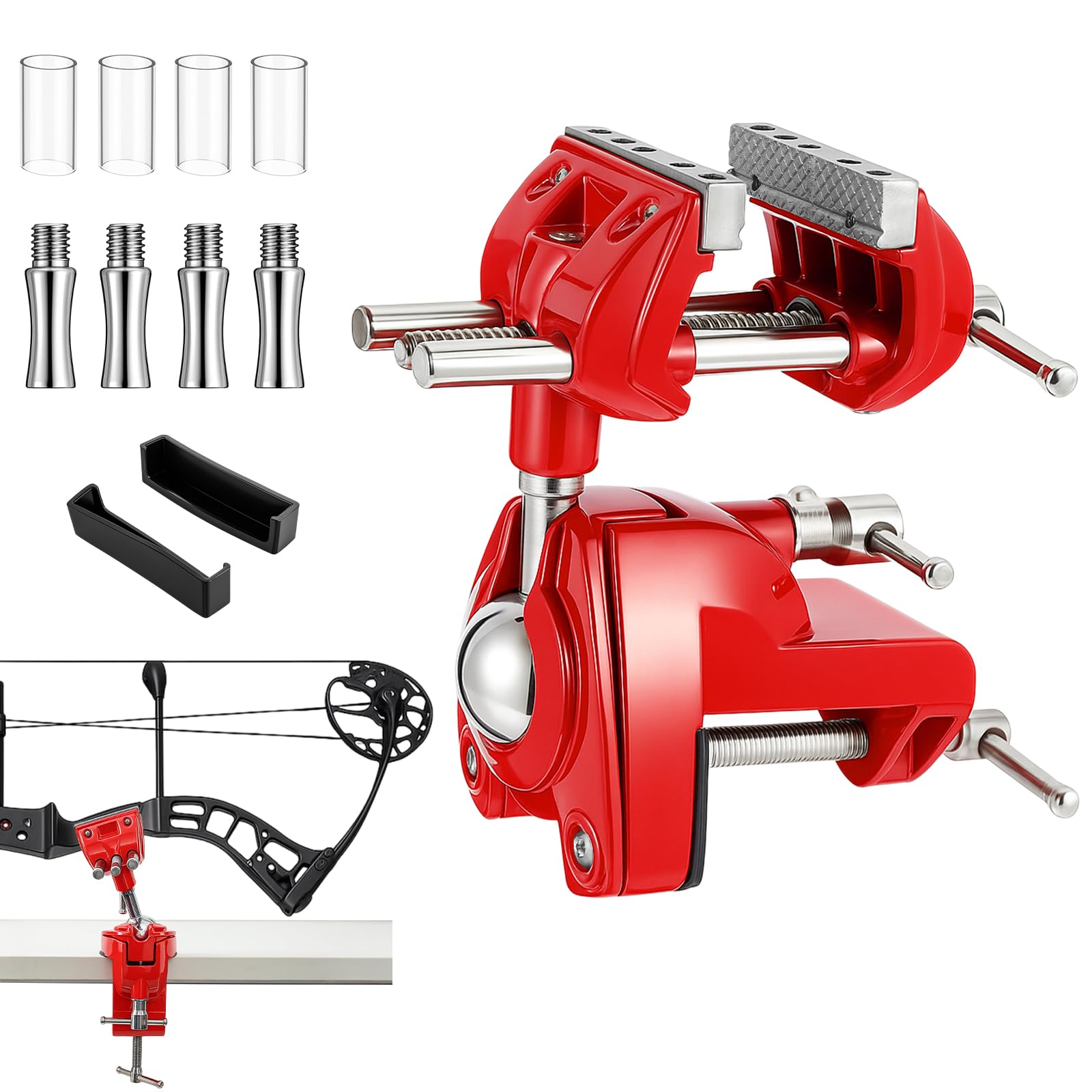This versatile and durable product, crafted from aluminum and rubber in striking orange and silver, ensures optimal performance with its 360° flexible rotation and easy desktop installation. The rubber jackets and four bowling pin clamping posts provide scratch protection and enhance grip stability, accommodating various bow types seamlessly.