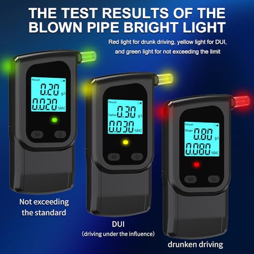 - Intelligent Voice Broadcast:This breathalysers comes with intelligent voice broadcast, clearly announcing the blowing process, power on/off status, combined with three-color indicator lights for multi-functional reminders. Different alcohol concentrations are displayed in different colors: green for low concentration, yellow for near-limit, and red for exceeding the limit, allowing you to intuitively check the results of these alcohol tester.