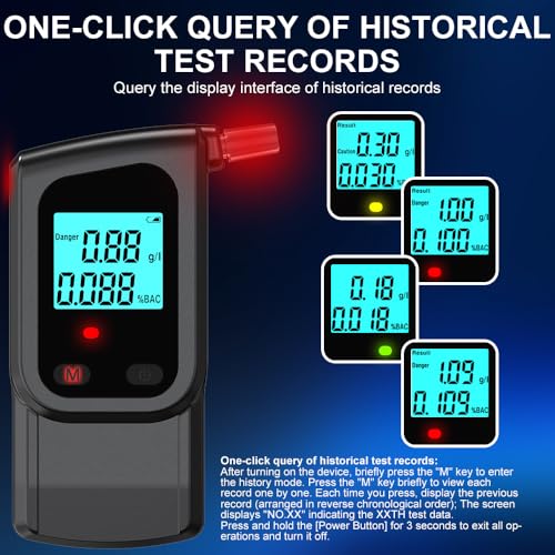 1.This breathalyzer alcohol tester emits clear voice prompts (e.g., “Blow”) and displays detection status via three-color LED indicators (green/yellow/red). The breathalyser can store the latest 20 test results for review (press the “M button” once after testing to check) — as a reliable alcohol testing kit, it is suitable for professional or personal use.