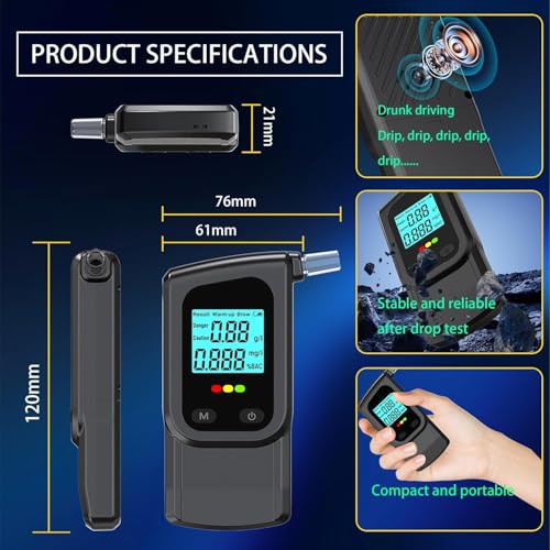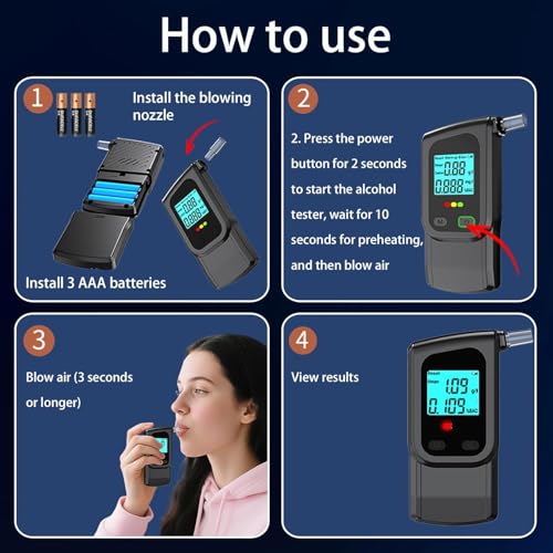 【Easy to use】Just insert the 3* AAA batteries, then need to press the button for seconds to start, and 10 seconds to warm up, then blow for 3-5 seconds, the result will be shown on the LCD screen later, and display two units of measurement at the same time – %BAC, g /l.